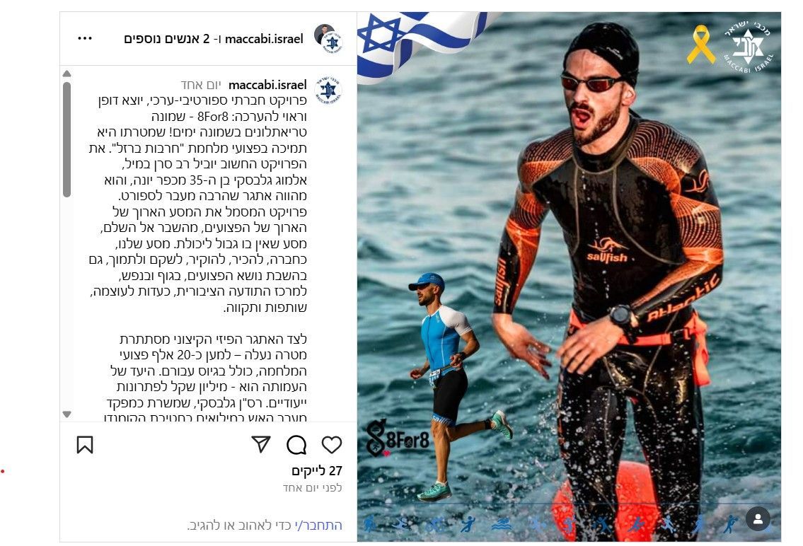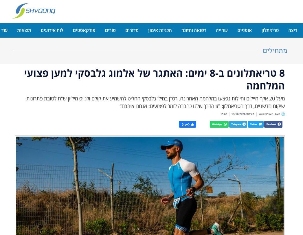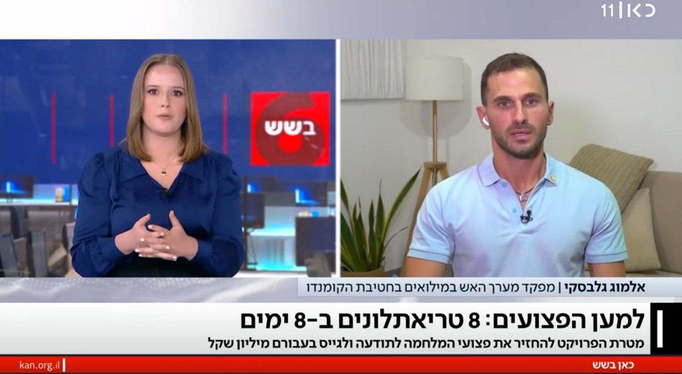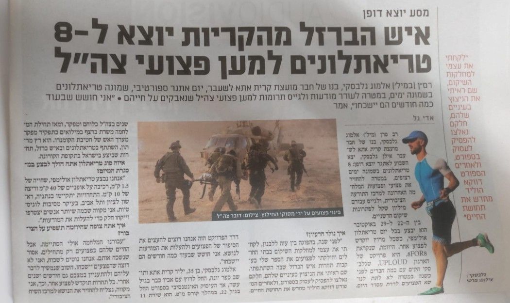 פרויקט חברתי ספורטיבי-ערכי, יוצא דופן וראוי להערכה: 8For8 - שמונה טריאתלונים בשמונה ימים! שמטרתו היא תמיכה בפצועי מלחמת "חרבות ברזל". את הפרויקט החשוב יוביל רב סרן במיל, אלמוג גלבסקי בן ה-35 מכפר יונה, והוא מהווה אתגר שהרבה מעבר לספורט. פרויקט המסמל את המסע הארוך של הארוך של הפצועים, מהשבר אל השלם, מסע שאין בו גבול ליכולת. מסע שלנו, כחברה, להכיר, להוקיר, לשקם ולתמוך, גם בהשבת נושא הפצועים, בגוף ובנפש, למרכז התודעה הציבורית, כעדות לעוצמה, שותפות ותקווה.